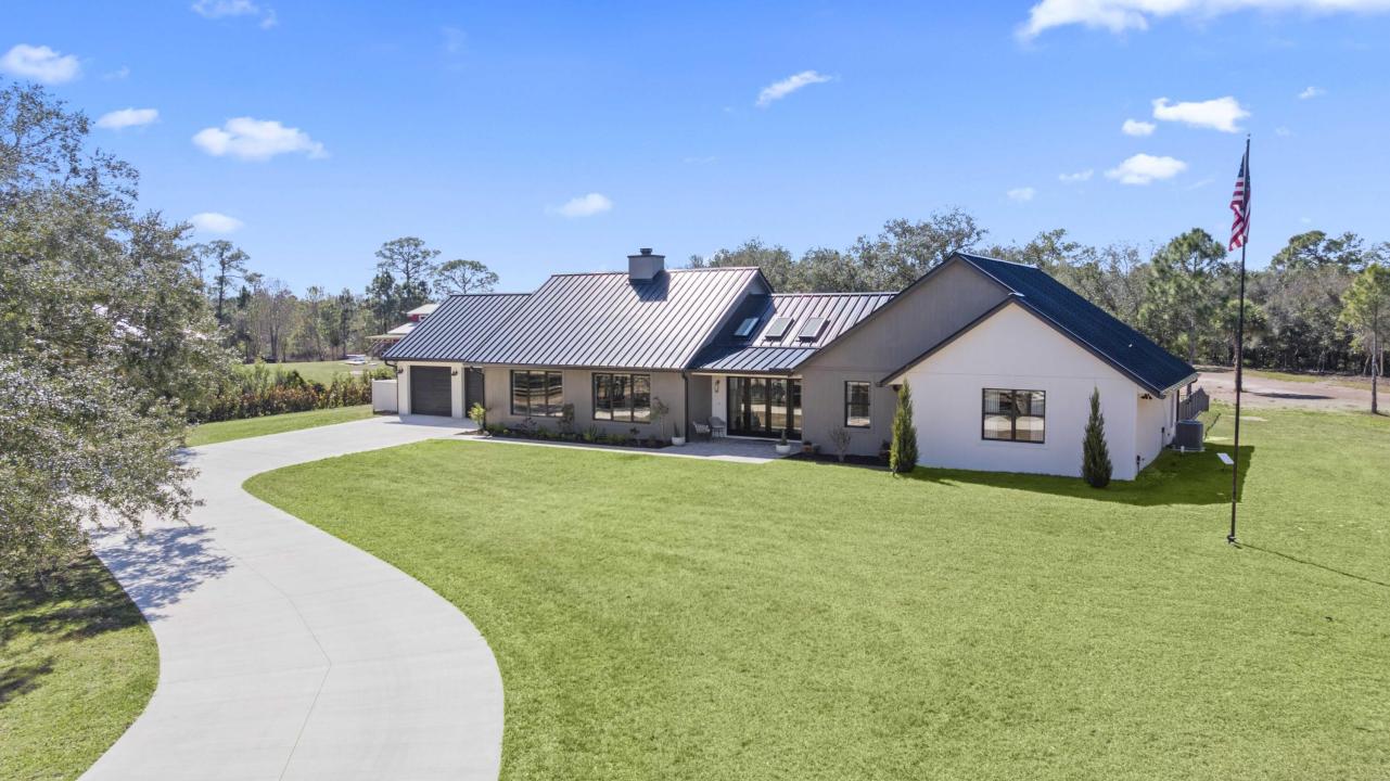 This rare, tranquil custom estate offers a blend of country living and sophisticated lifestyle in a healthy natural, spa inspired setting. Located in the highly sought out Bridlewood Ranches, a private, gated equestrian community, this exquisite 4 bedrooms/2 full 2 half bathroom luxury home was built in 2024. It is Located on 5+ acres on a cul de sac and was built with intention by owners, showcasing exceptional craftsmanship and attention to detail. Features include a standing-seam metal roof, oversized garage, hurricane-impact windows and doors and a stunning kitchen with 11' island and smart home functionality. The fully equipped, mirrored gym features professional equipment with seamless outdoor spaces including heated pool, integrated spa, and outdoor 6 person sauna/wet area. Elevated finishes throughout with soaring tray ceilings designed with cypress beams. Multiple French doors and expansive windows provide a calming flow from luxurious inside amenities to the natural outdoor spa area. Privacy, beauty and lifestyle in one exceptional home surrounded by abounding nature. The home is offered partially furnished, personal items and artwork not included. Many items and decor negotiable.